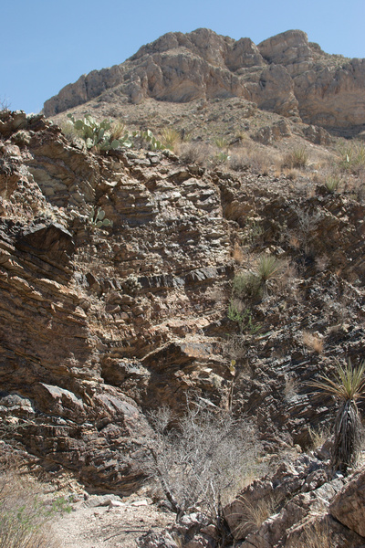 The wash leads up two (dry) waterfalls. Look for cairns to show you the path. The path leads to the left on the first one and to the right on the second. Along the way, take a look at the rock layers, which are very interestings. There is an interesting kind of black rock (not shown here) that looks like coal but is rock. Everywhere the rock looks like it had a pretty tortured life, but it makes for some interesting hiking. The guide book says that “not even geologists have been able to figure out what happened here.”
