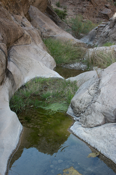 There is something about this stream which was really picturesque and relaxing.  There is the carved rock, the pools of water, the green grass (after two days of desert, grass that is green is particularly pleasant), and the stairs carved into the rock that is inviting yet a little mysterious.  Who carved these stairs?  Did they choose to live here in the canyon?  Am I going to be attacked by the bear(s) that are rumored to be in the region?