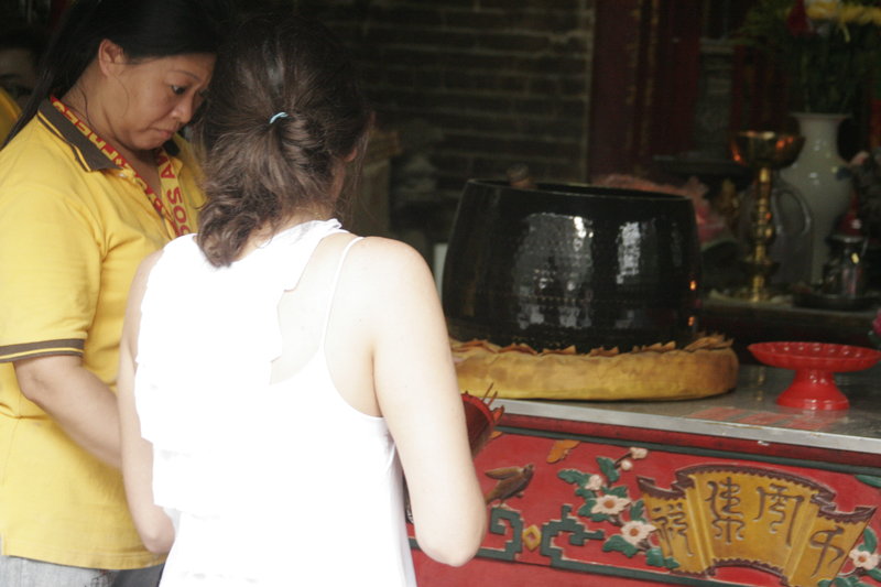 The temples all let you buy a fortune. The Japanese temples are efficient: pay your money, get your fortune stick. The Chinese temples seem a little more serious about it. You take the container full of sticks, kneel in front of the altar, and shake the container in such a way that one stick comes out. Apparently it is harder than you would think, since the woman in yellow had to demonstrate several times.