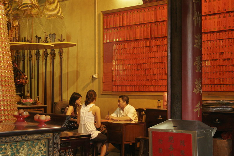 This is the American girl again. I think this is where you go to figure out which fortune you got. I assume the man is explaining the fortune to her friend, and I suspect that the red things on the wall are the possible fortunes. (The stick has a number or something to allow lookup of the actual fortune)