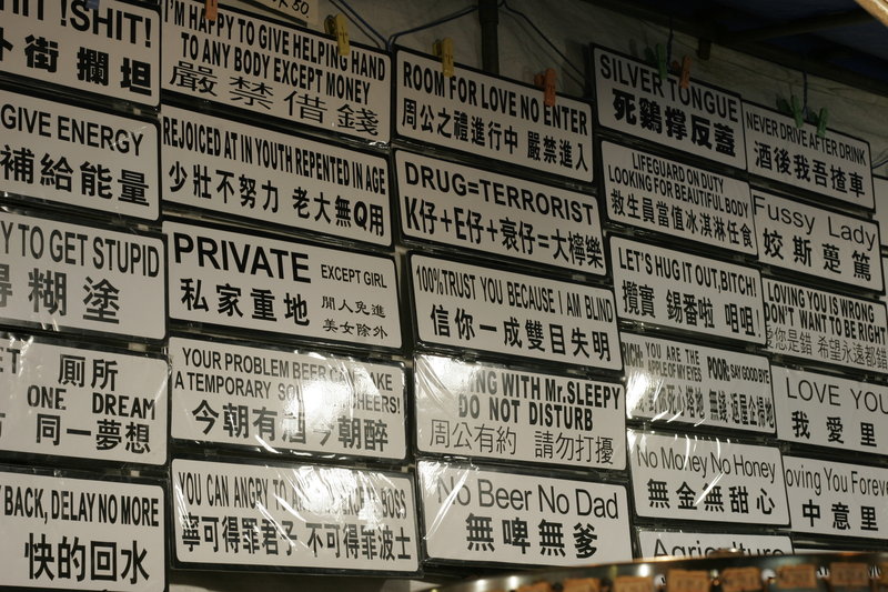Christine said that there is a Chinese phrase that literally says something like “You could have sold me,” meaning “I trusted you so much that you could have sold me and I would not have noticed.” I wonder if “100% trust you because I am blind” is supposed to mean something similar. Some of the rest are eerily transparent (“You can angry to anyone except to boss” and “Lifeguard on duty; looking for beautiful body”). And then there are the ones that accidentally reveal the relational truths we do not realize about ourselves (“Room for love; no enter”).