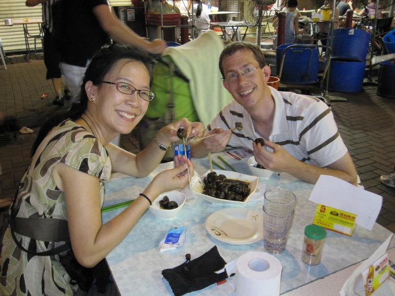 At the end of the night market (walking north), turn left, and the shop on the south-east corner of the next street has most excellent seafood. I saw whelks on the menu and it sounded really interesting, ignored the waiter-guy’s concern that Americans do not generally like them, and I tried it anyway. The reason Americans are not into them is that apparently all the little baby whelks live with the parents, so you end up with a bunch of crunchy baby whelk shells. The taste is good, though.