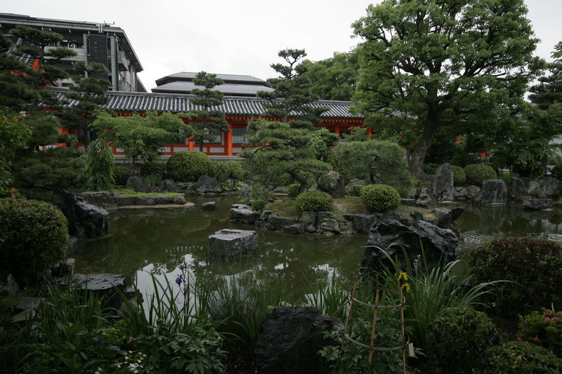Sanjusangendo is also not a Zen Buddhist temple, being dedicated to Kannon, the thousand-armed deity each of whose arms saves a world. The garden, however, also has many of the Zen features. There pond’s shape is somewhat irregular, and there is a definite island in the center. I cannot remember if there is a bridge on the far side, but there may have been since I remember that when I took the picture from the opposite side, I made sure to position myself to keep something out of the picture. This garden also has the feature of interesting rocks, although there are perhaps too many of them to look natural. There is also a distinct sculptural element to the garden; it almost invites you to walk around it.