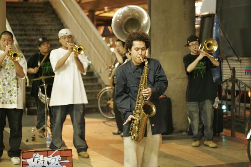 Saturday night there was a great brass band playing on the street at Umeda station. (Blitz and Squash, http://basbb.com) They attracted quite a crowd, but got busted by the police after a while. Too bad, I was really enjoying them.