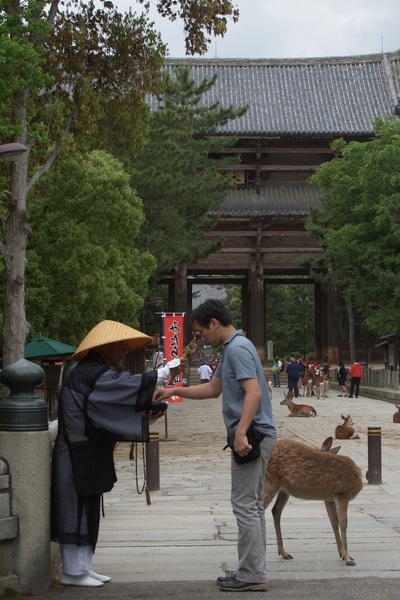 In front of Todaiji there was monk with a bowl murmuring sutras. This man has just put some coins into his bown, and the monk is gesturing with his staff. If you look closely, you can see the characteristic three rings on either side. When the staff is full size, I think the rings are supposed to jingle as the monk walks so that the bugs will get out of the way and not be accidentally killed by the monk.
