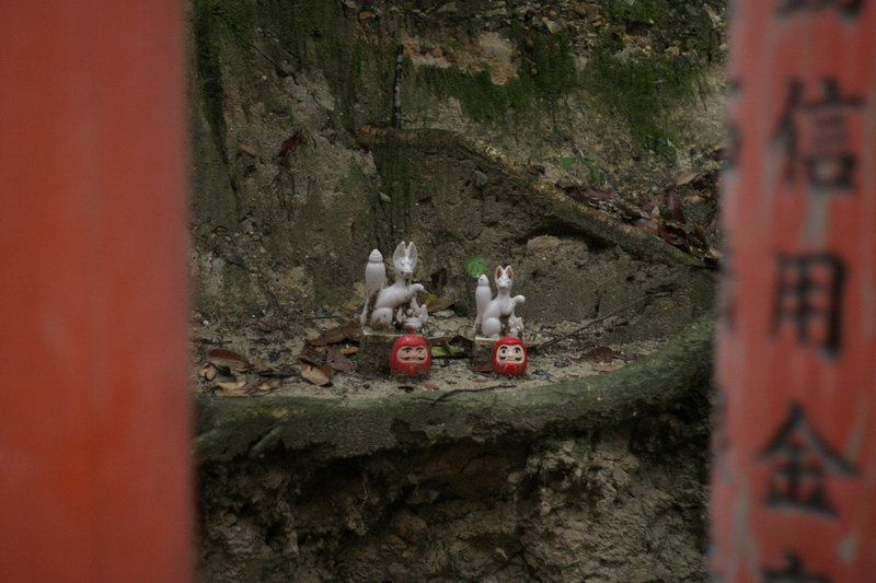 I noticed these small figurines my first time at the shrine. The fox is the messenger for Inari, and the head is a daruma doll. You fill in one eye when you buy it (they may come with one eye already painted) and then paint the other eye in when your wish comes true. I take these figurines to mean that two people were thanking Inari for making their wishes come true.